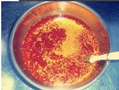 3、用一瓷器装入芝麻酱、花生酱、大蒜细沫、花椒粉,特鲜1号、鸡精、白糖、精盐等拌和均匀。 4、 用菜油烧到八成熟放入泡椒细沫炸香,然后倒入瓷器调好的料中盖上盖子,让冷却后再尝一下,如果咸了,适当放点白糖味精,淡了加点盐即成飘香酱