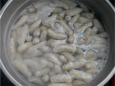 3:捞出来煮熟的面筋串串,要记得放入冷水中,让面筋串降温,让内部的面和冷水发生反映。